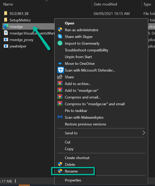 - Select the **msedge.exe **file. Next, right-click on the file and select **Rename**.