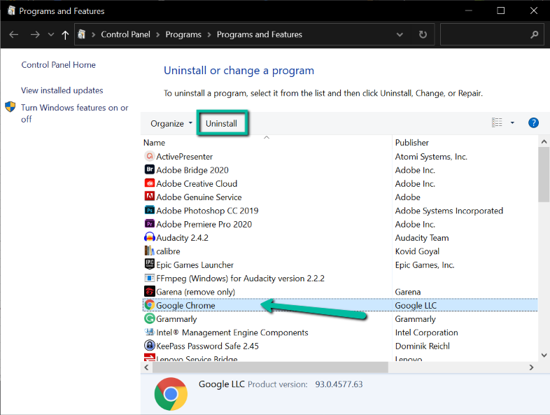 - In the Control Panel, select **Chrome** and select **Uninstall. **
