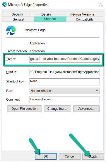 - On the Properties window, switch to the **Shortcut** tab. On the Target field, paste this **C:\Program Files (x86)\Microsoft\Edge\Application\msedge.exe” – disable-features=RendererCodeIntegrity**. Click **Apply **then **OK**.