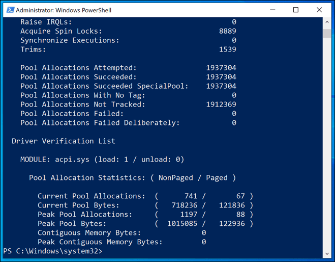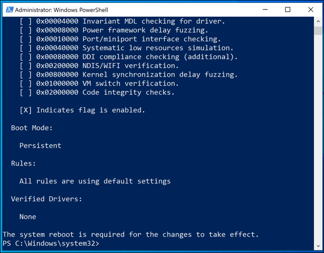 - To stop Driver Verifier from running its driver stress test, type **verifier /reset** at the PowerShell window and hit enter, then restart your PC.
