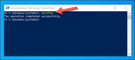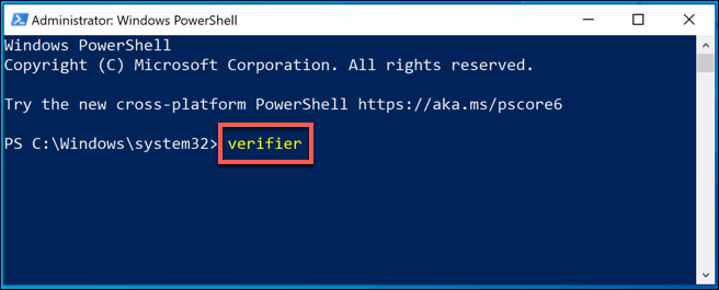 - In the new PowerShell window, type **verifier **to open the Driver Verifier tool.