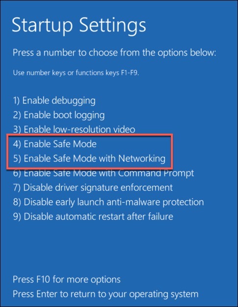 - After your PC restarts, select **4** or **F4** to boot into Safe Mode, or **5** or **F5** to boot into Safe Mode with networking features enabled.