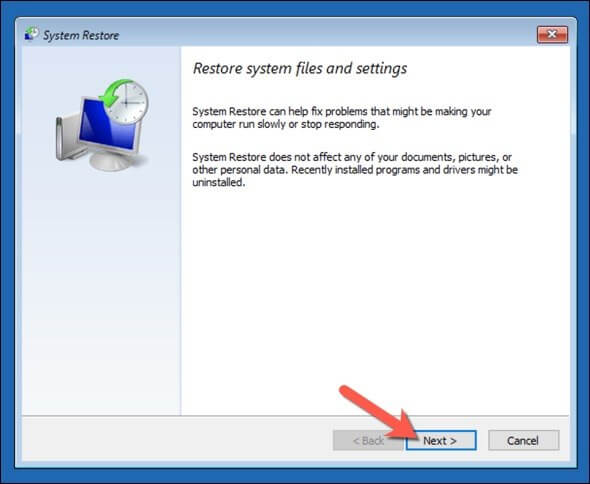 - Select the system restore point you created before you ran the Driver Verifier tool from the list provided, then select **Next** to continue.