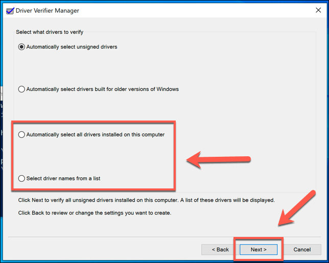 - To test all the drivers on your PC, select the **Automatically select all drivers installed on this computer** option and then press **Finish**. If you want to test a specific driver, choose **Select driver names from a list** instead, then press **Next**.