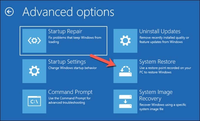 - You’ll need to boot into the Automatic Repair menu to do this. When you see the Windows logo during the boot up process, select and hold the power button to switch your PC off before stwitching it on again. Repeat this process at least twice to see the **Automatic Repair **options menu, then select **See advanced repair options **> Troubleshoot > Advanced options > System Restore to begin the restoration process.