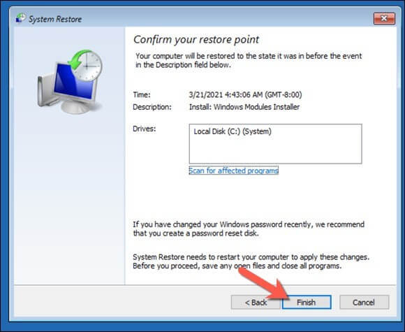 - Once you’re ready to restore your PC using this System Restore point, select **Finish**.