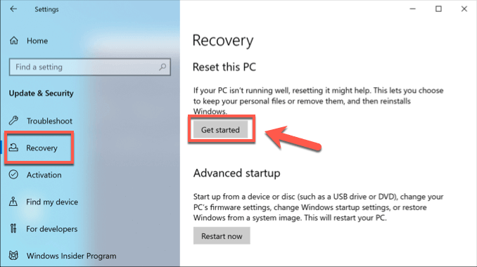 - To begin a full Windows reset, right-click the Start menu and click Settings. Once opened, press Update & Security > Recovery and press Get started to begin resetting your PC.