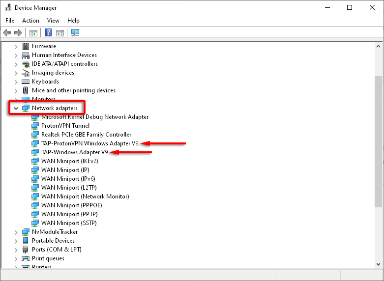 - Select **Network Adapters**. * Search for **TAP-Windows Adaptor V9 **or any similar names.