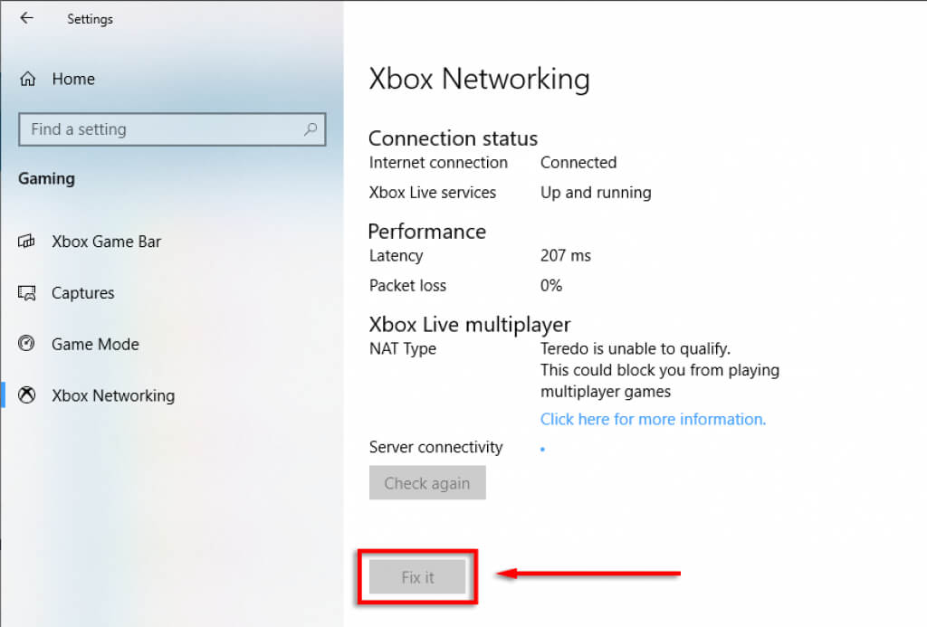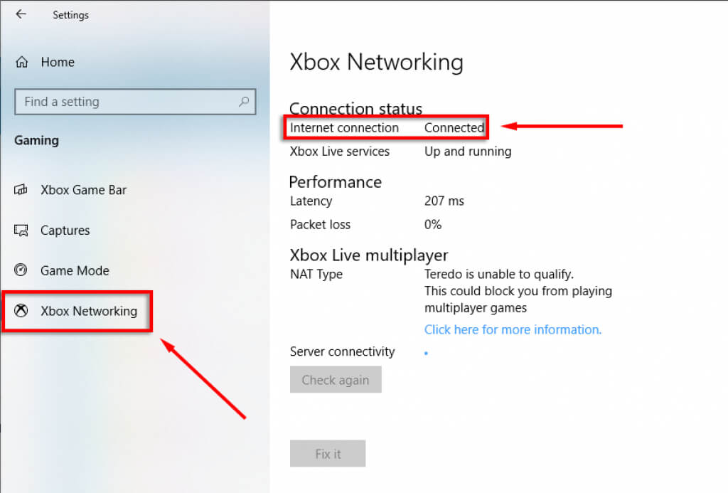 - Select **Gaming** > **Xbox Networking**. * Under **Connection status** check to see that **Internet connection** is **Connected**.