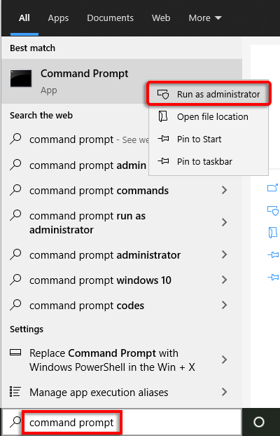 - Press the Windows key and type “**Command Prompt**”. * Right-click **Command Prompt **and select **Run As Administrator**.