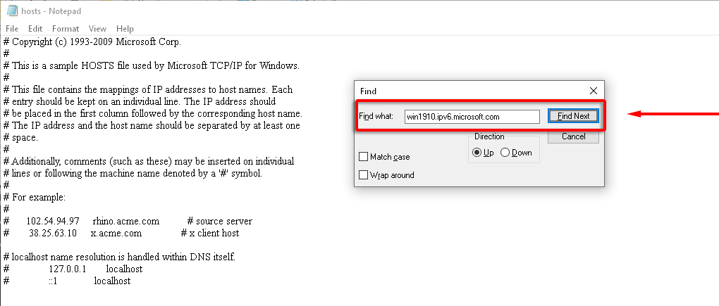 - Note the server name value, for instance, **win1910.ipv6.microsoft.com.** * Open the hosts file by running the following command: