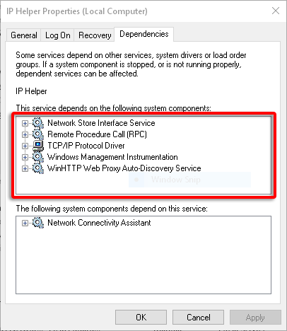 - Find and double-click **IP Helper**. * Switch to the **Dependencies** tab. * Under **This service depends on the following system components** section, note all of the listed components.