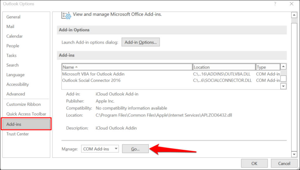 - Select Add-ins on the sidebar and select the Go button at the bottom of the page.