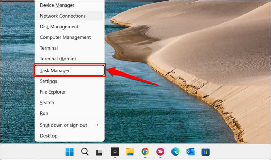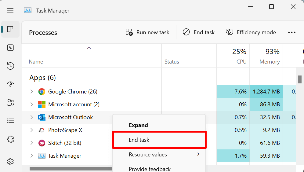 Alternatively, right-click Microsoft Outlook and select End task on the context menu.