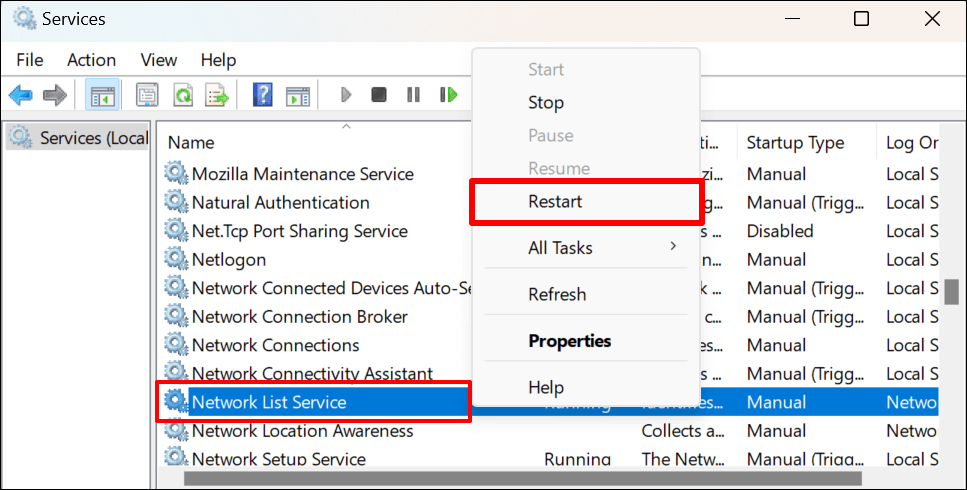 - Next, right-click the Network List Service and select Restart.