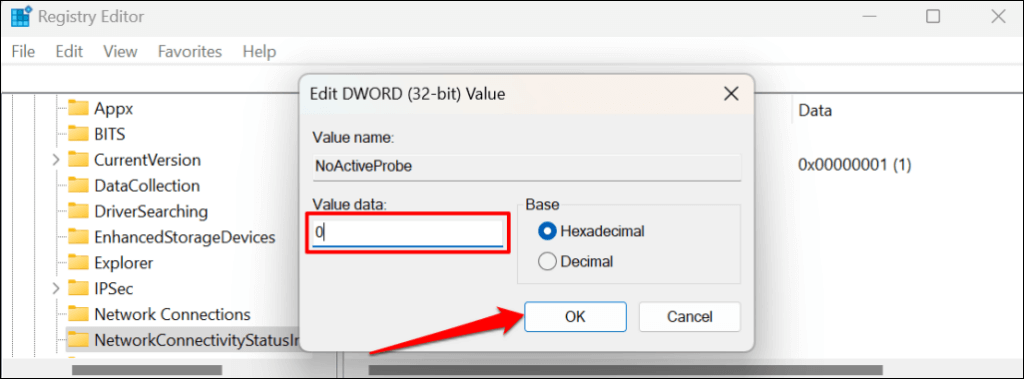 - Modify the “NoActiveProbe” if its value data is set to one (1). Double-click the entry, change the Value data to 0, and select OK.