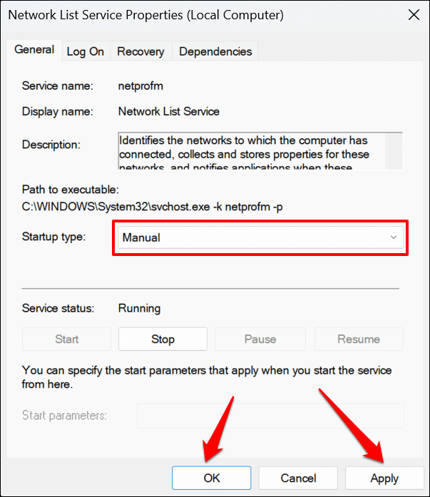 - Change the “Startup type” to Manual, select Apply, and select OK.