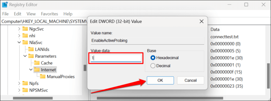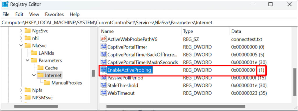 - Locate the EnableActiveProbing DWORD entry and ensure its value data (the digit in the bracket) is set to 1. A zero (0) value data means the NCSI active probe is disabled. Double-click EnableActiveProbing to modify its value data.