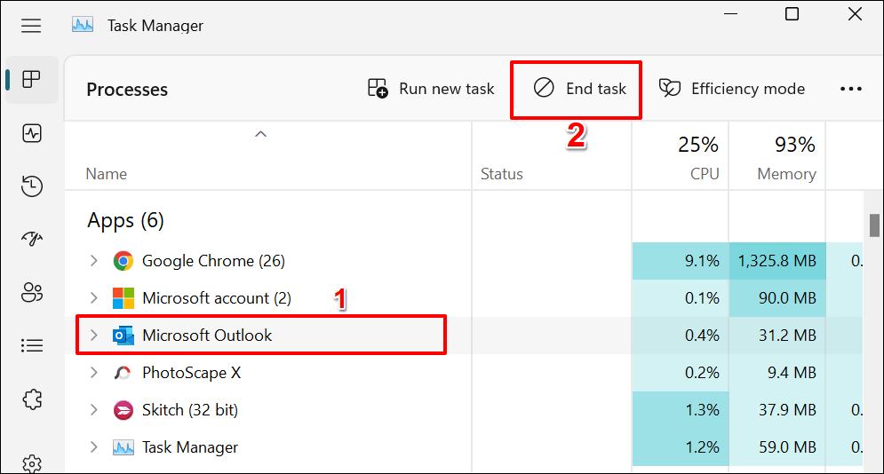 - Select Microsoft Outlook on the list of apps and select the End task icon.