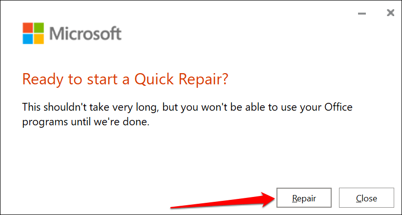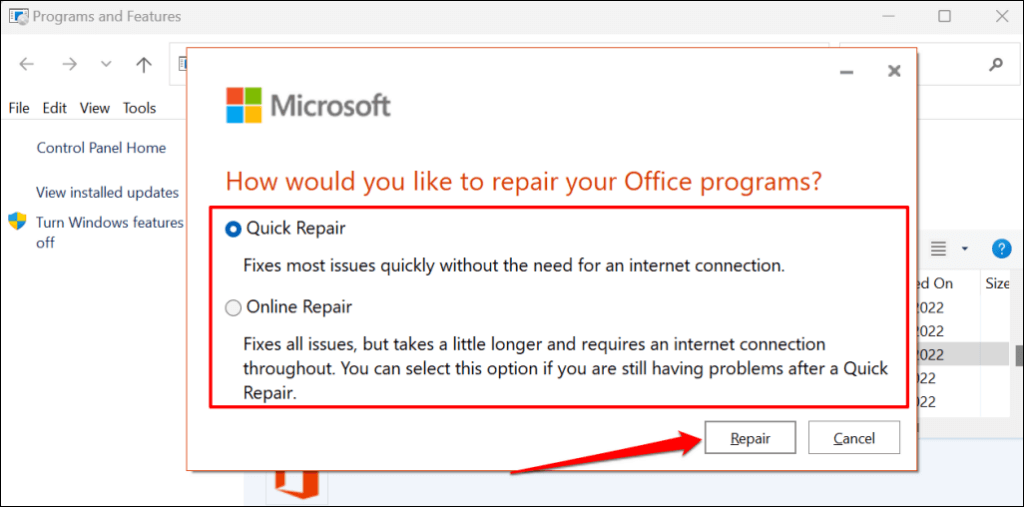 - Select Quick Repair or Online Repair and select the Repair button.