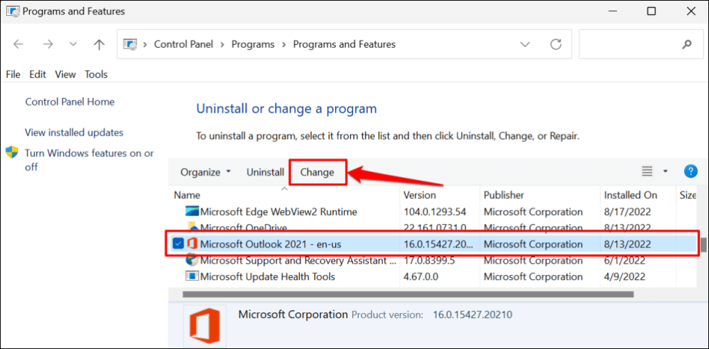 - Select Microsoft Outlook on the program list and select Change.