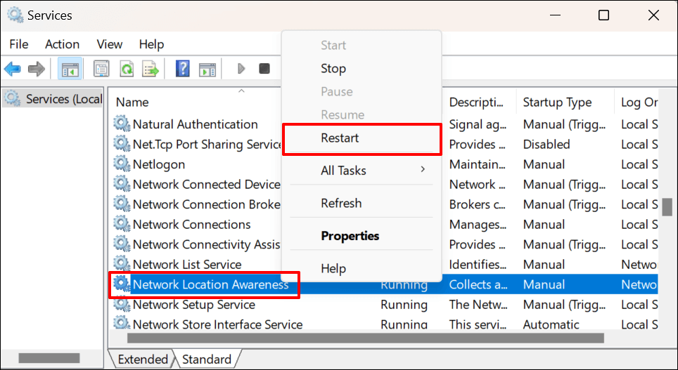 - Right-click Network Location Awareness and select Restart. Select Start if “Restart” is unavailable or grayed out on the context menu.