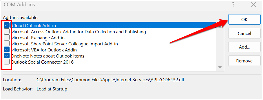 - Uncheck all extensions on the page, select OK, and restart Microsoft Outlook.