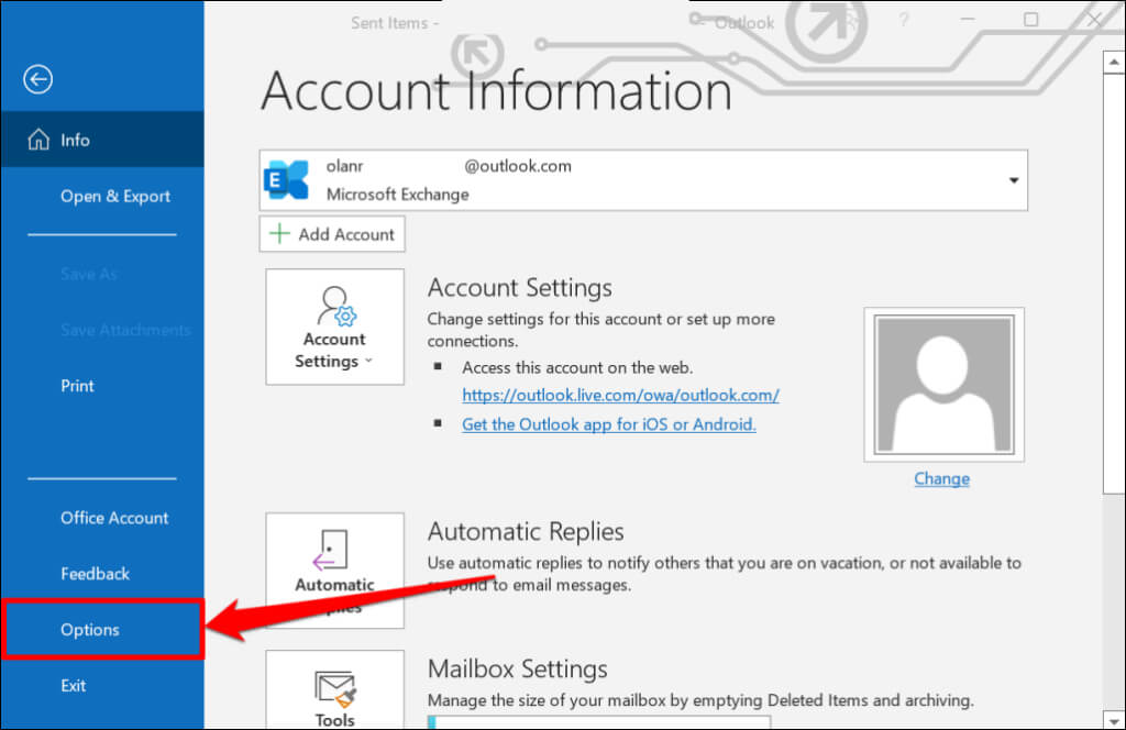 - Open Microsoft Outlook, select File on the menu bar, and select Options on the sidebar.