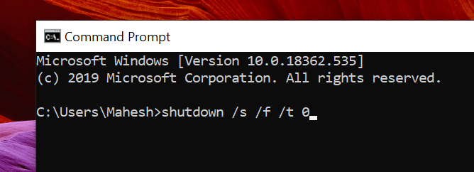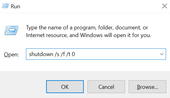 - Type in the following command and hit Enter. shutdown /s /f /t 0