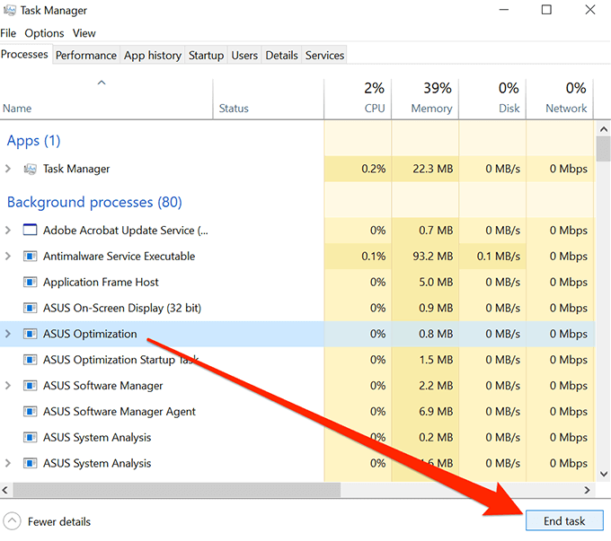- Go to the Processes tab if you aren’t already there. Select each process that you identify as an app and click on the End task button. You need to do it for each process in the list.