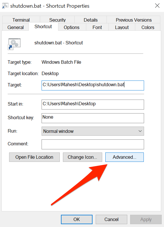 - Make sure you’re inside the Shortcut tab. Then find and click on the Advanced button.