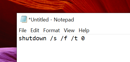 - You’ll use the same command you used in the Command Prompt utility in Notepad. Type in the following command. shutdown /s /f /t 0