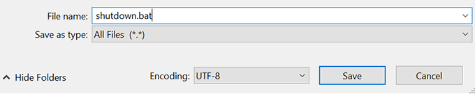- Enter a name for your file followed by a dot and then bat. It should look something like shutdown.bat.