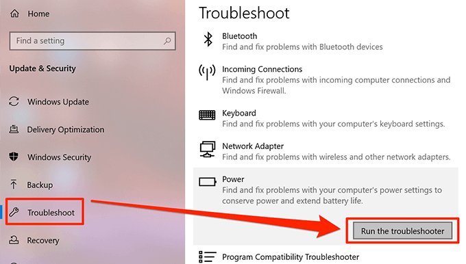 - Select Troubleshoot in the left sidebar, click on Power on the right-hand side pane, and choose Run the troubleshooter.