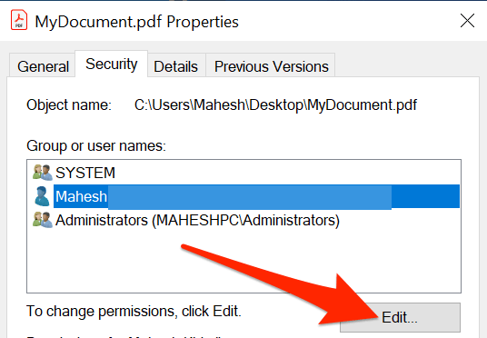 - From the **Group or user names** section, select your user account and select the **Edit** button.