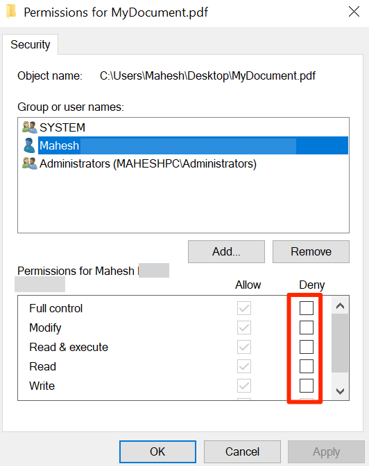 - In the **Permissions** section at the bottom, remove all checkmarks from the **Deny** column.