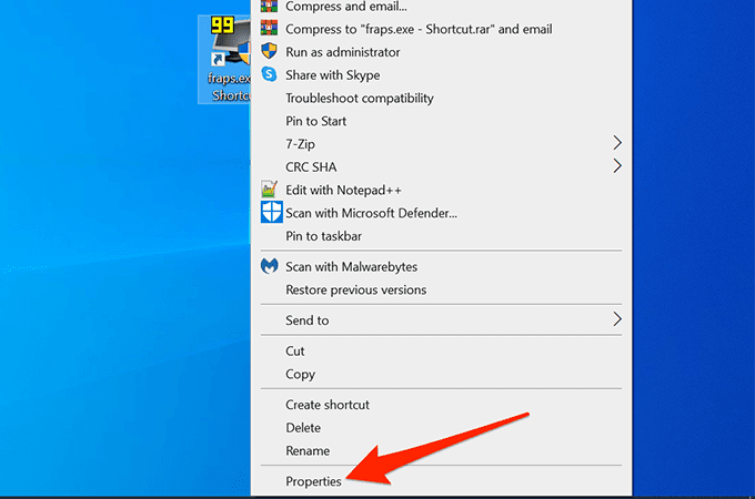 - Right-click the shortcut and select Properties.