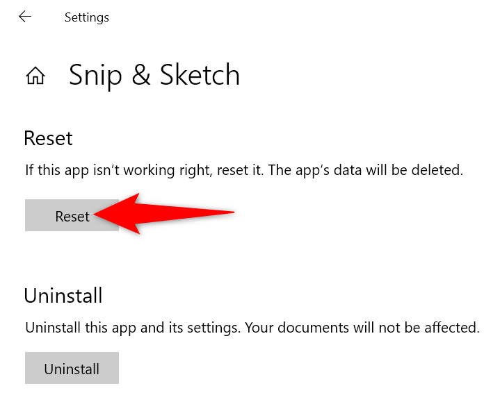 - Choose **Reset** in the prompt that opens. * Launch **Snip & Sketch **after you’ve reset the app. * Use the **Windows** + **Shift** + **S** keyboard shortcut to try to take a screenshot.