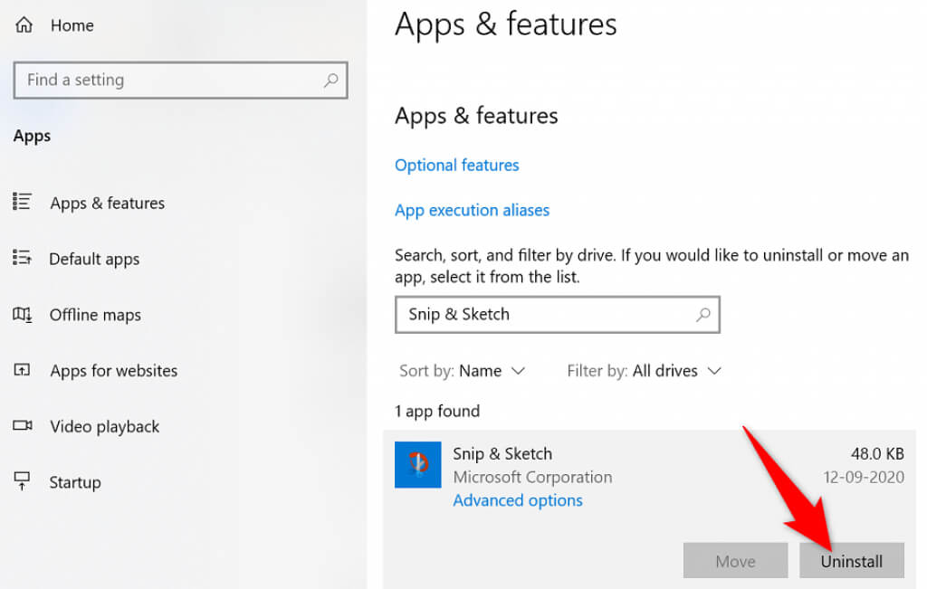 - Find and select Snip & Sketch on the app list. Then, choose the Uninstall button.