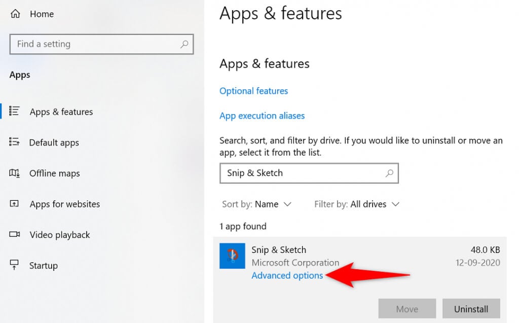 - Find and select Snip & Sketch on the list. Then, choose Advanced options.