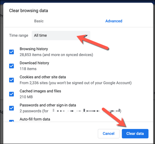 - In the **Clear browsing data **menu, make sure that **All time** is selected from the **Time range **drop-down menu and that all of the available checkboxes are selected. Select **Clear data **to clear your browser cache and web history at this point.