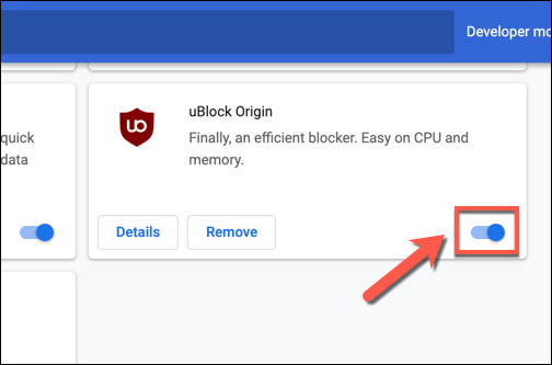 - You’ll see a list of installed extensions in the **Extensions** menu. To disable any extension you believe might cause issues with YouTube, select the **slider button** for that extension, switching it to the **Off** position. If you’re unsure whether any of the extensions are causing this problem, disable all extensions to test your browser.