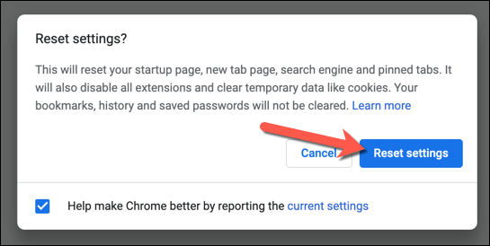 - Confirm that you want to reset your settings accordingly. This will wipe your entire browser configuration, including custom startup pages, any installed extensions, and your browser cache and history. Select **Reset settings** to do this.