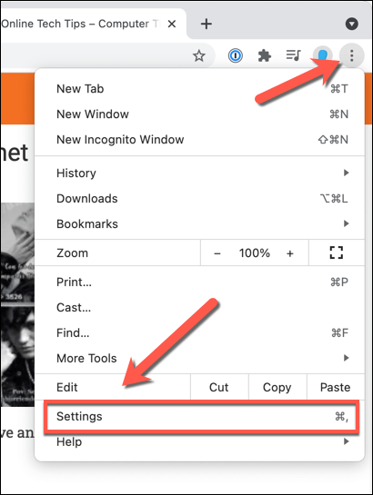 - To do this in Chrome, select the **three dots menu icon **> Settings.