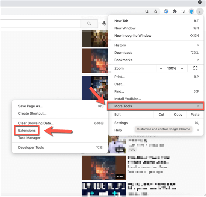 - If you’re using Google Chrome, you can quickly disable Chrome ad-blocking extensions by selecting the **three-dots menu icon **> **More Tools **> Extensions.