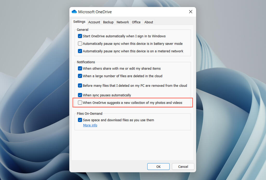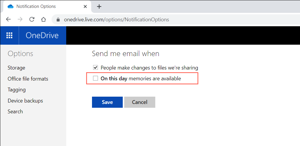 Note: On older versions of OneDrive, you may see an option labeled When “On this day” memories are available instead. Uncheck it to stop “On this day” notifications.