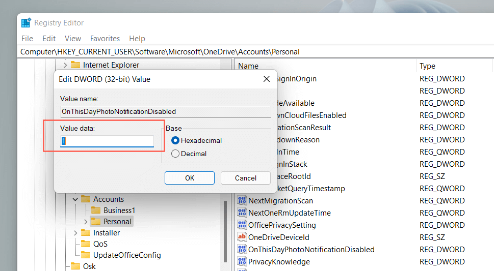 Note: If the registry entry in step 4 appears missing, right-click Personal and select New > **DWORD (32-bit)**Value. Name it as **OnThisDayPhotoNotificationDisabled **and save it with a Hexadecimal value of 1.