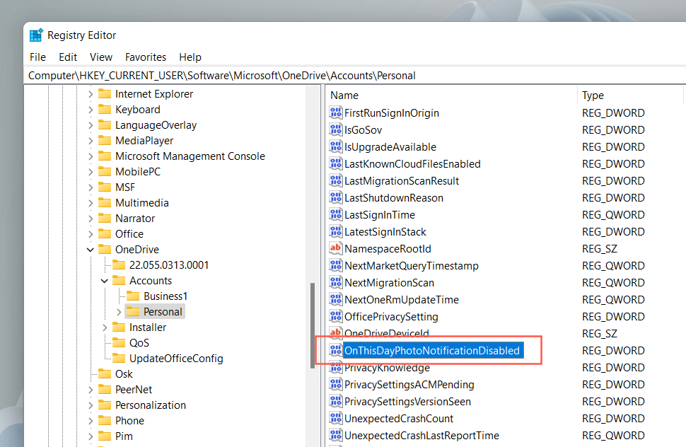 - Select the **Personal **folder on the sidebar. Then, double-click the OnThisDayPhotoNotificationDisabled registry entry on the right side of the window.