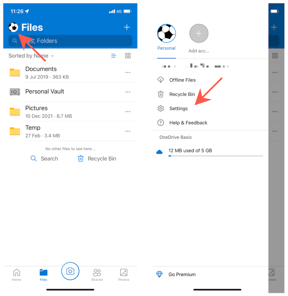 Open **OneDrive **and tap the profile portrait at the top-left of the screen.