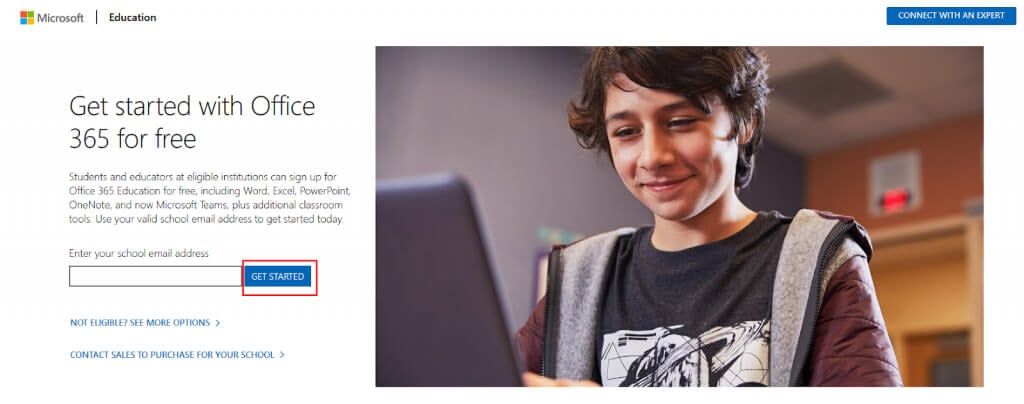 All you have to do to sign up for free Microsoft Office 365 as a student or a teacher is to enter your valid school email address on the official webpage and press the Get Started button.